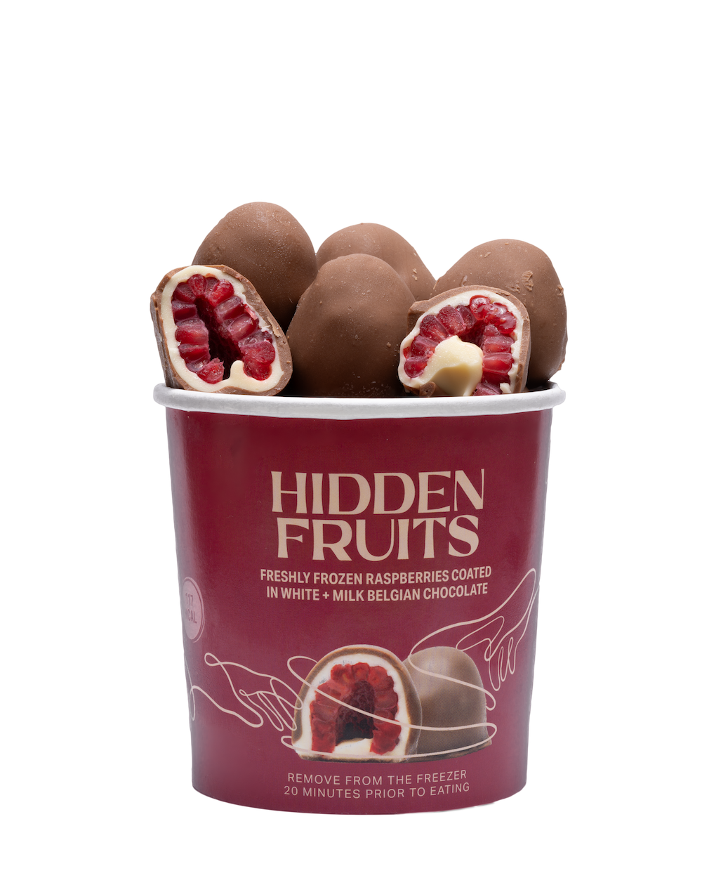 Hidden Fruits are fresh British raspberries, frozen, coated in white & milk Belgian chocolate. We’re a small team, founded by husband & wife, Fiona & Manuel in 2023. We might have outgrown our kitchen at home, but we’re still making everything ourselves. We hope you love them.