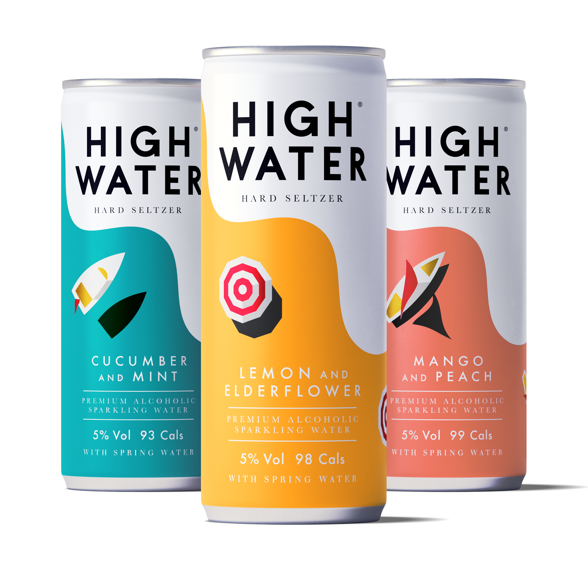 High Water hard seltzer - premium alcoholic sparkling flavoured water (5% ABV) is made in the UK with the finest natural flavours, British vodka, spring water and a tiny dash of fruit juice to naturally sweeten them. No preservatives or artificial ingredients. 93 - 99 calories per can, GF and Vegan